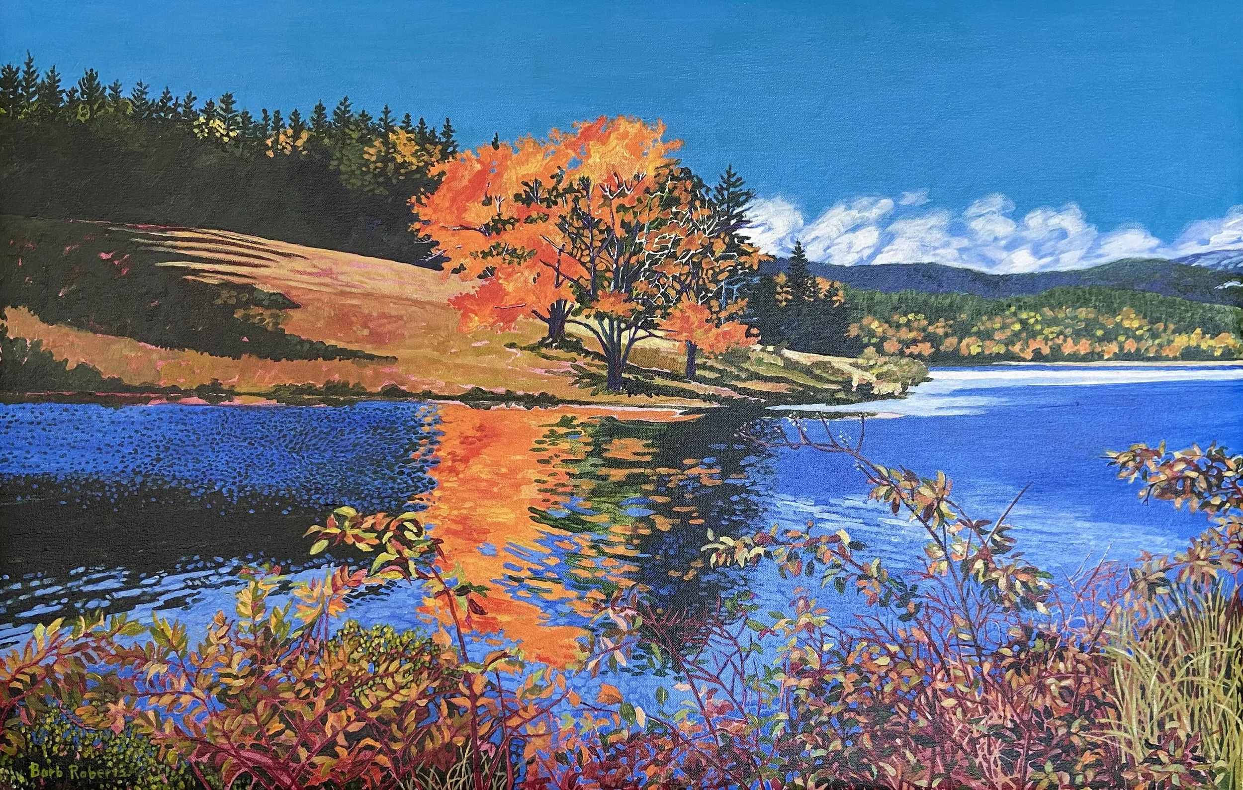 33”w x 24”h - Acrylic - On a very brilliant sunny day, I walked around Jordan Pond in Acadia National Park enjoying the beautiful fall colors. Gold-edged black floater frame. $4,000