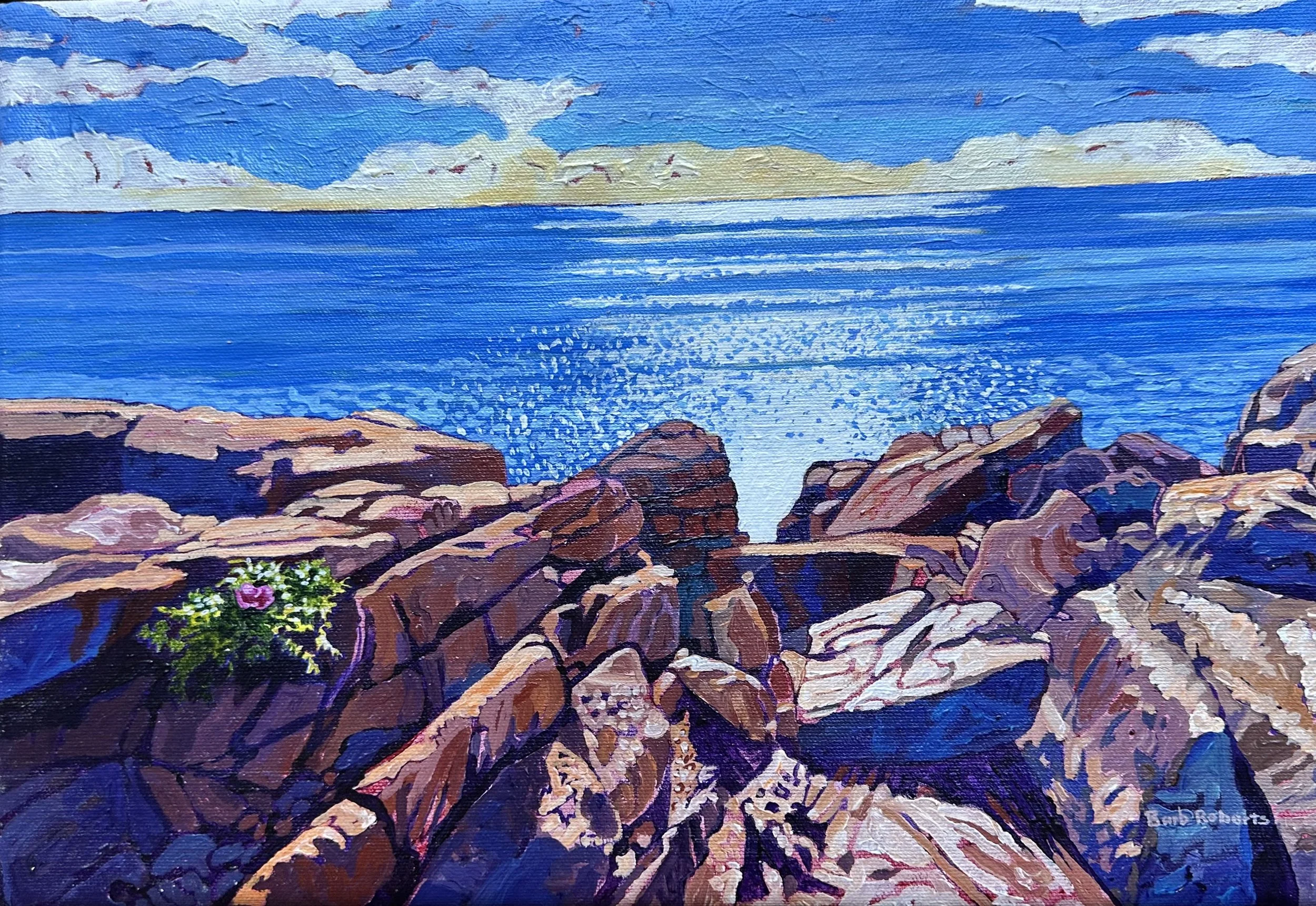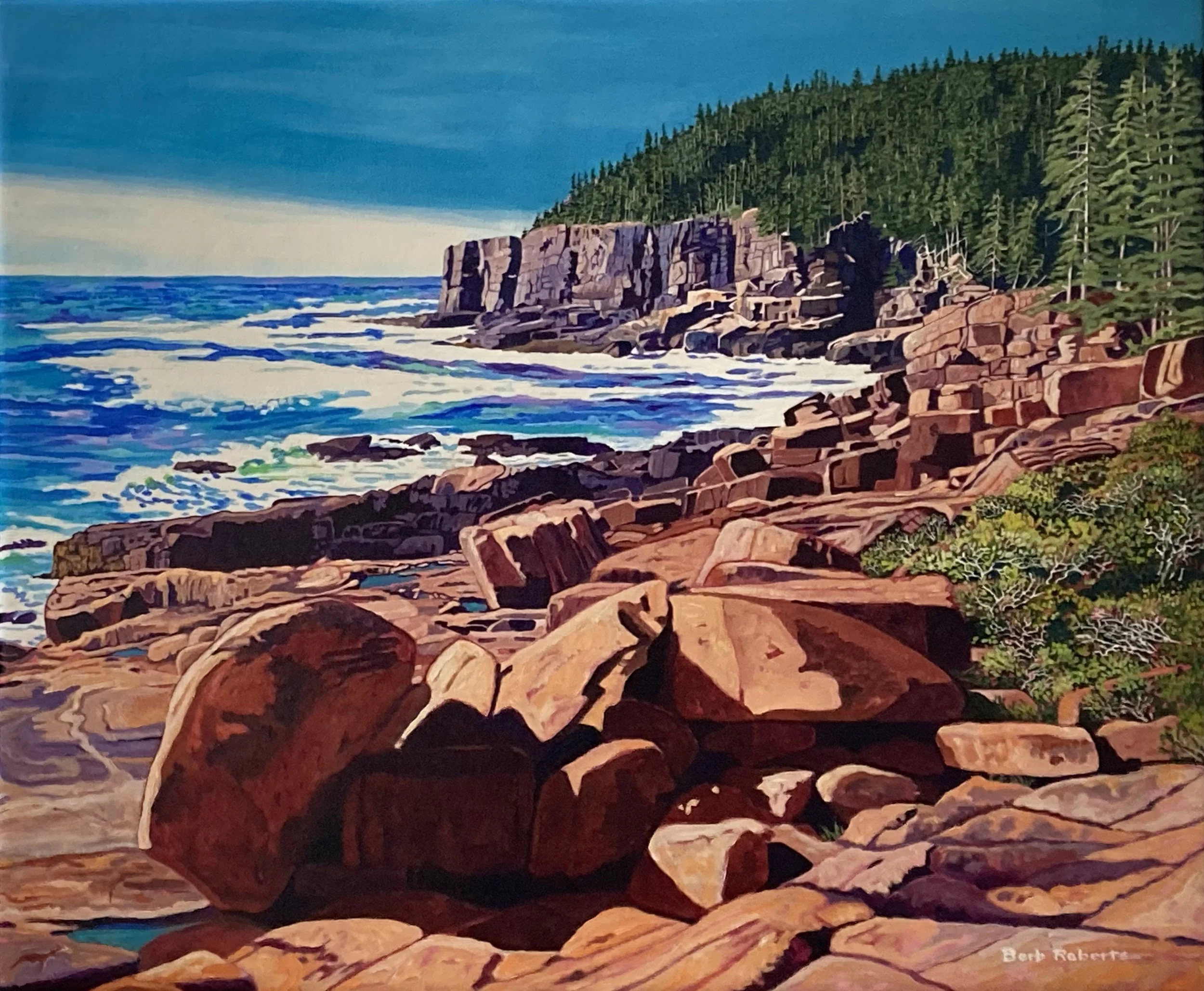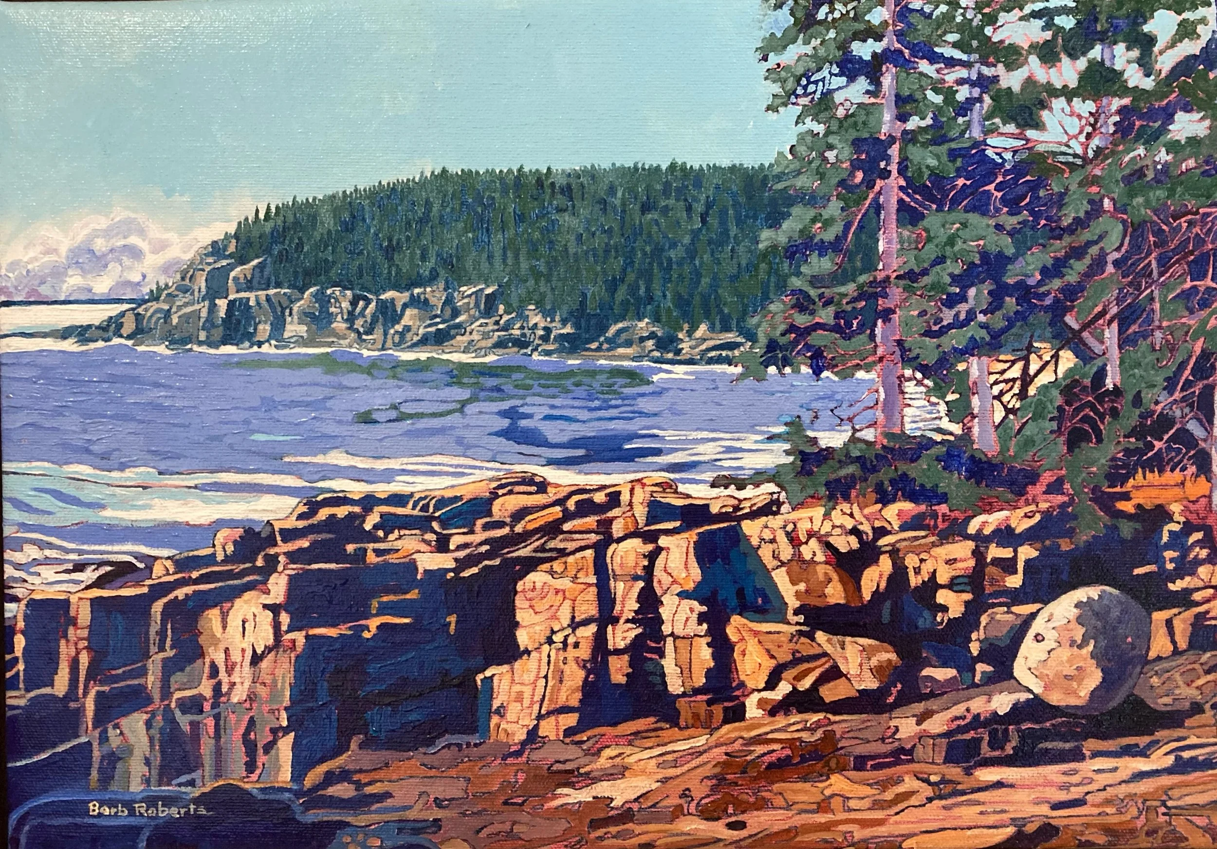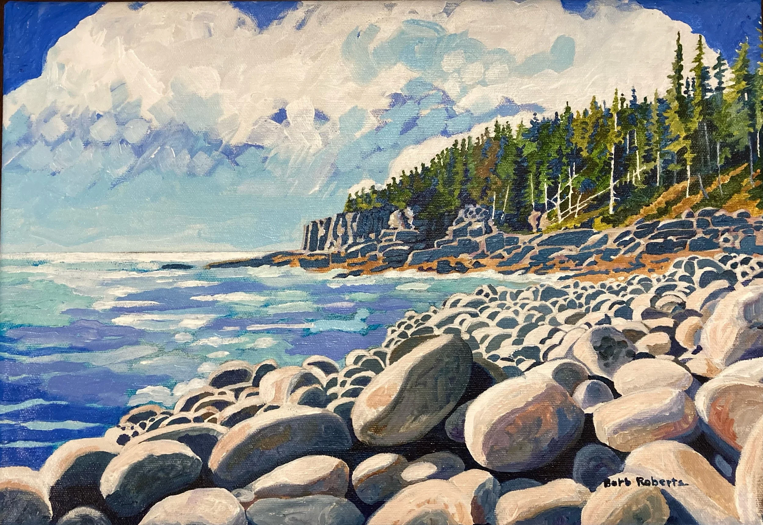 16“w x 11“h - Acrylic -Nearly white boulders formed by the ocean waves over millennia. Otter Point in the background at Acadia National Park.