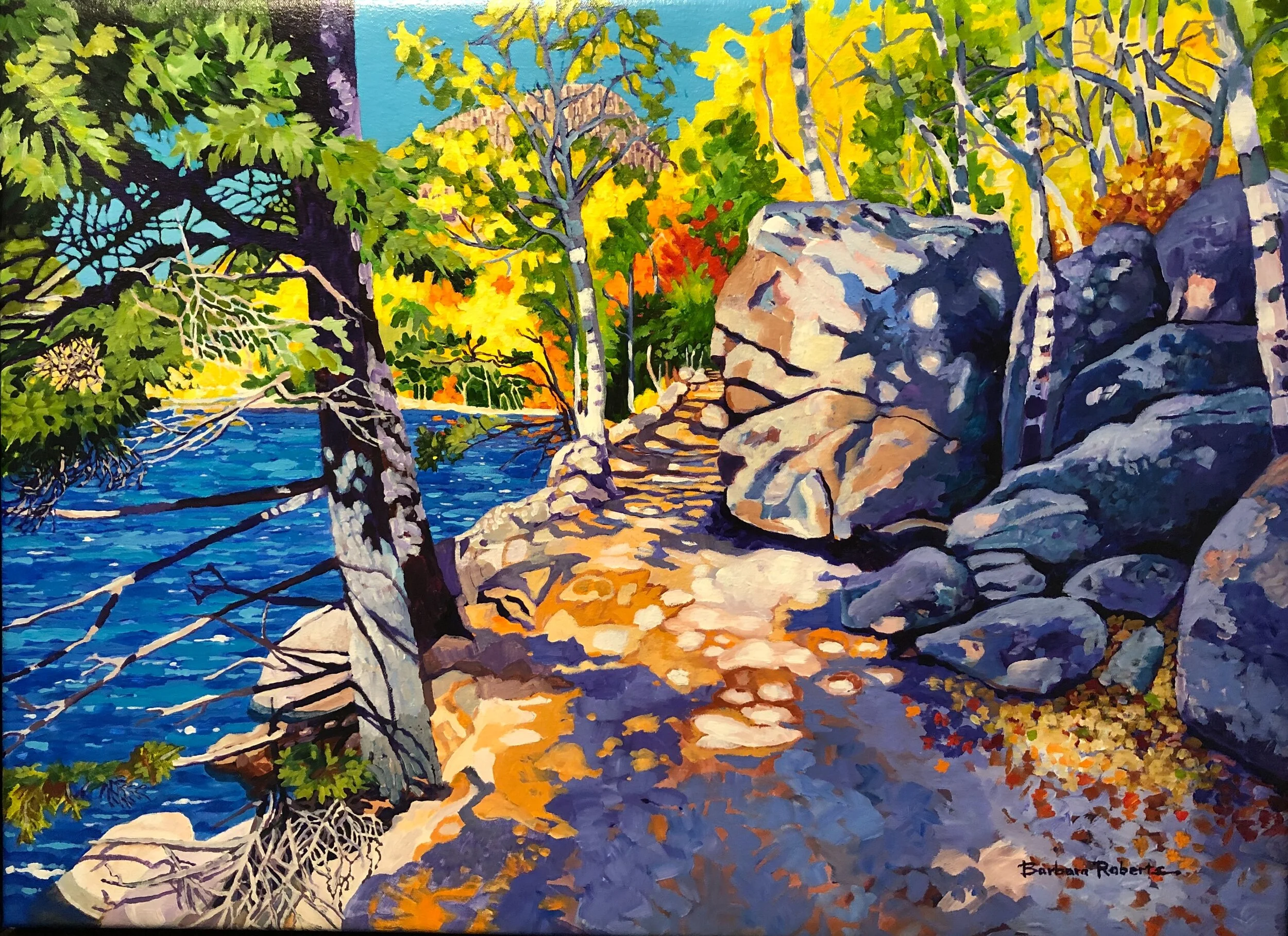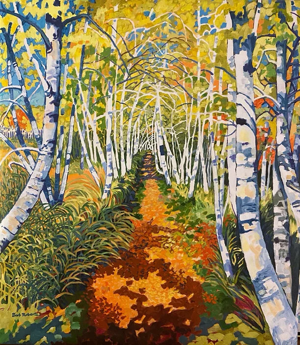 28”w x 32”h - Acrylic - A colorful, quiet and private place in the fall. I try to walk on this path every time we visit the National Park. Gold-edged black floater frame. $4,000