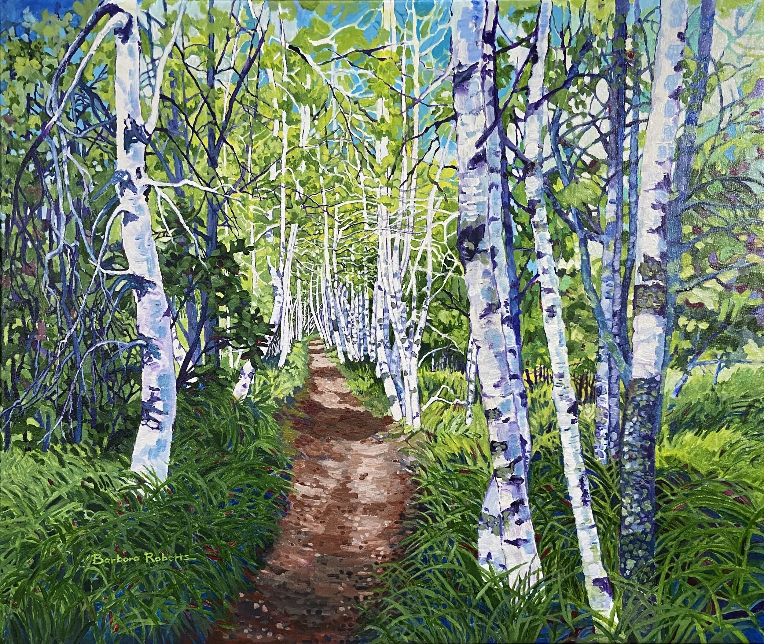 32”w x 27”h - Acrylic - A lovely summer walk among the birches in Acadia National Park, Maine. Gold-edged black floater frame. $5,500