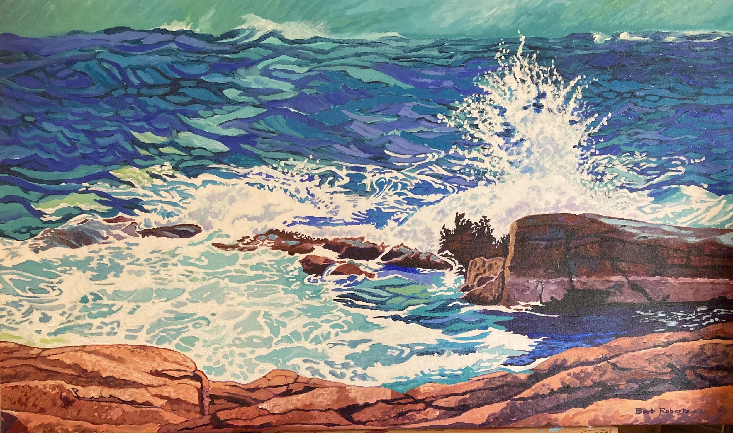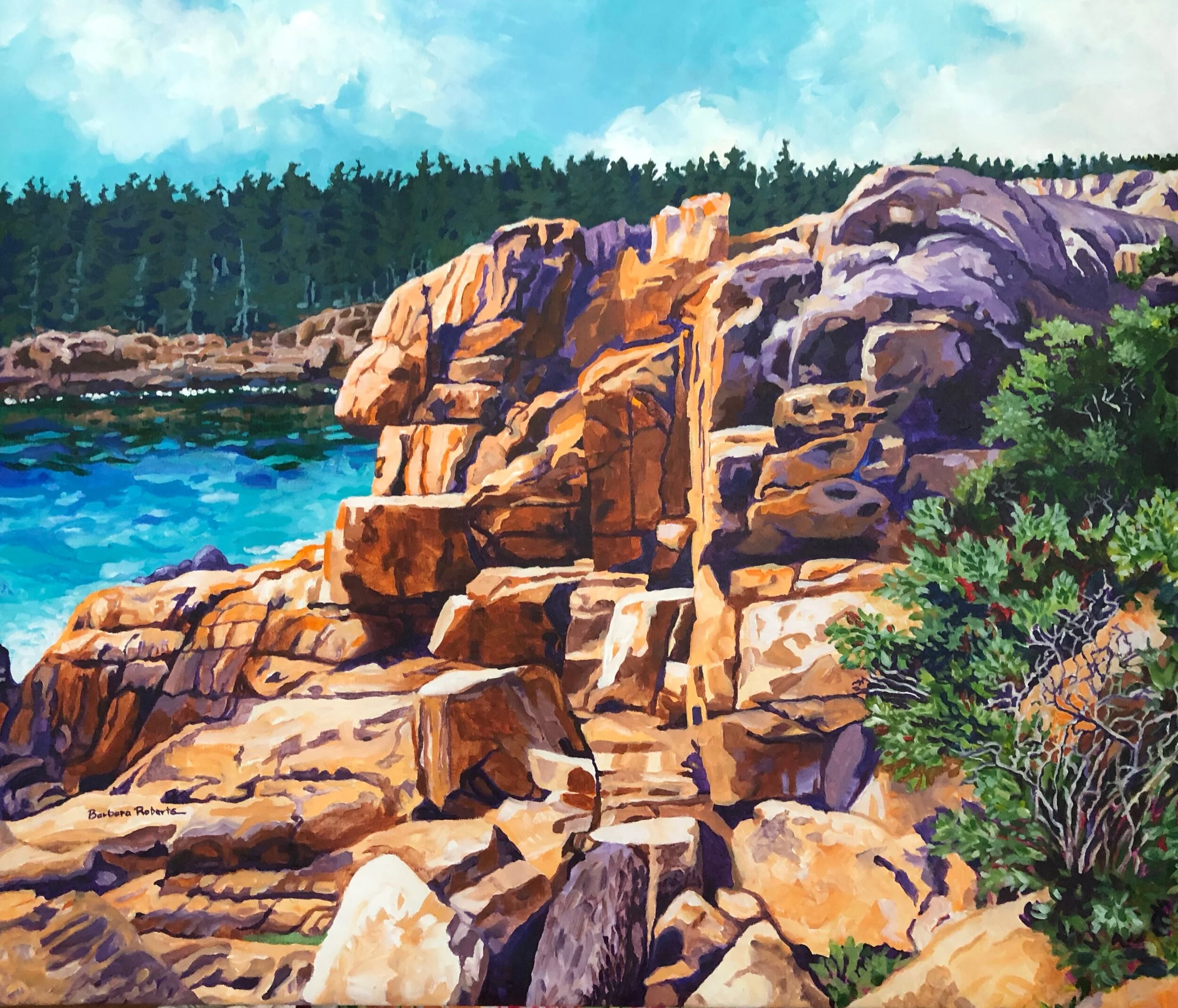 36”w x 30”h - Acrylic - The rocks along the shore path in Acadia National Park are in many places pink granite but in other areas black lava, evidence that Cadillac Mountain was once a volcano. The cliffs at Otter Point are older bedrock and called “Bar Harbor Formation”, made up of sandstone & siltstone layers. Gold-edged black floater frame. $5,500