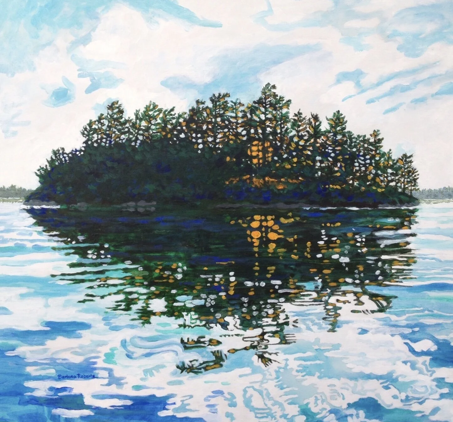 35”w x 34”h - Acrylic - During a wonderful sunset sail, we enjoyed this view of an island in the Basin, Phippsburg, Maine. Gold-edged black floater frame. $4,000