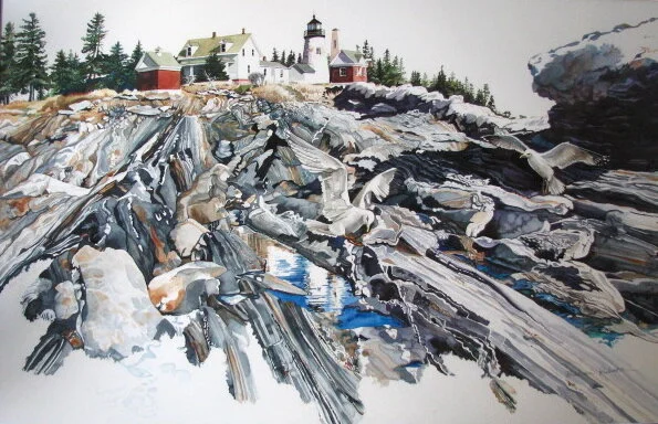 34”w x 22”h - Watercolor - Said to be the most photographed lighthouse on the coast of Maine, this watercolor shows the mix of volcanic, quartz and granite rock on which it sits. It was used for the face of the newly minted quarter. Black metal frame w/ glass. In private collection.