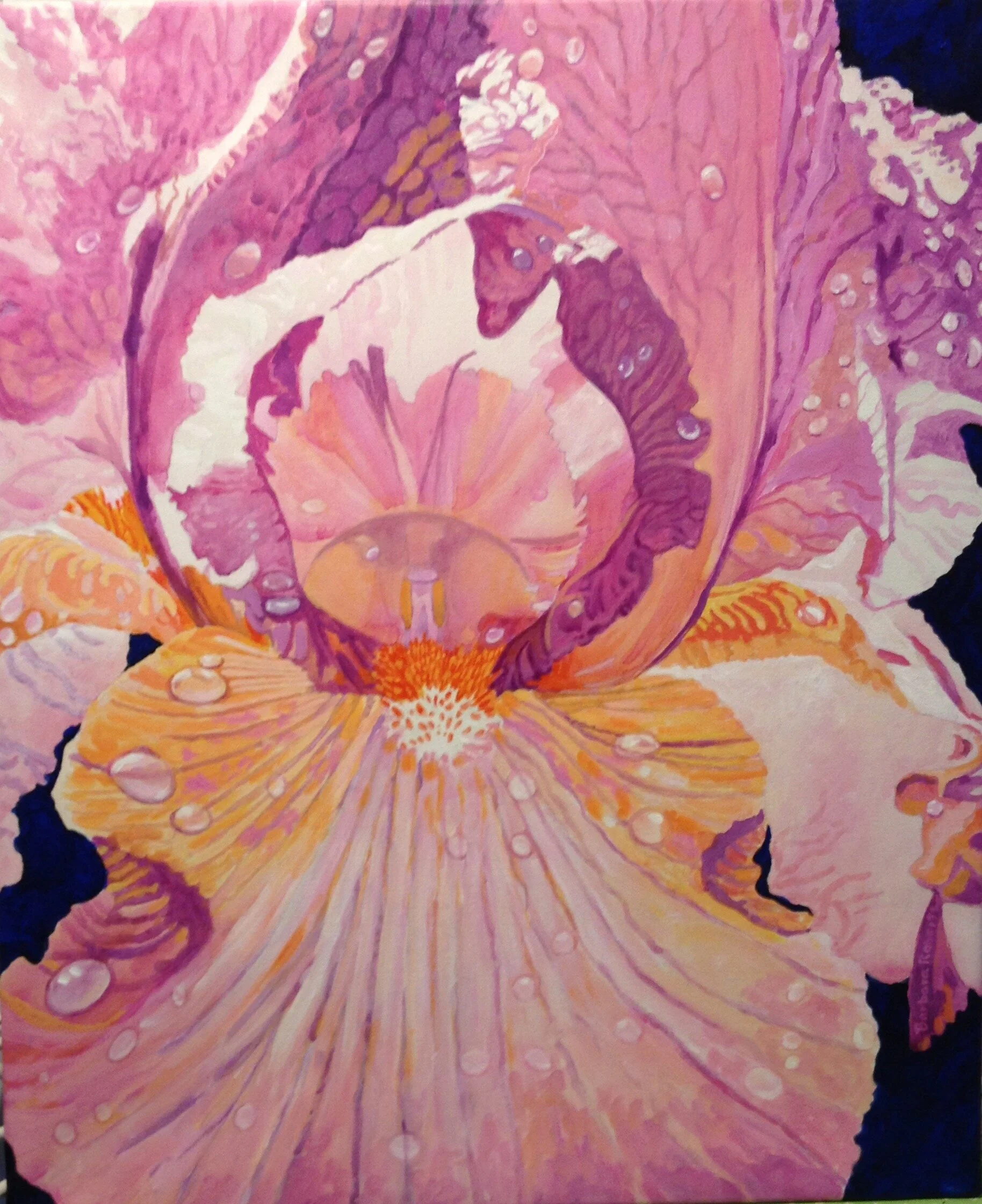 25”w x 30”h - Acrylic - A pink iris from my garden. Gold-edged black floater frame. $4,000