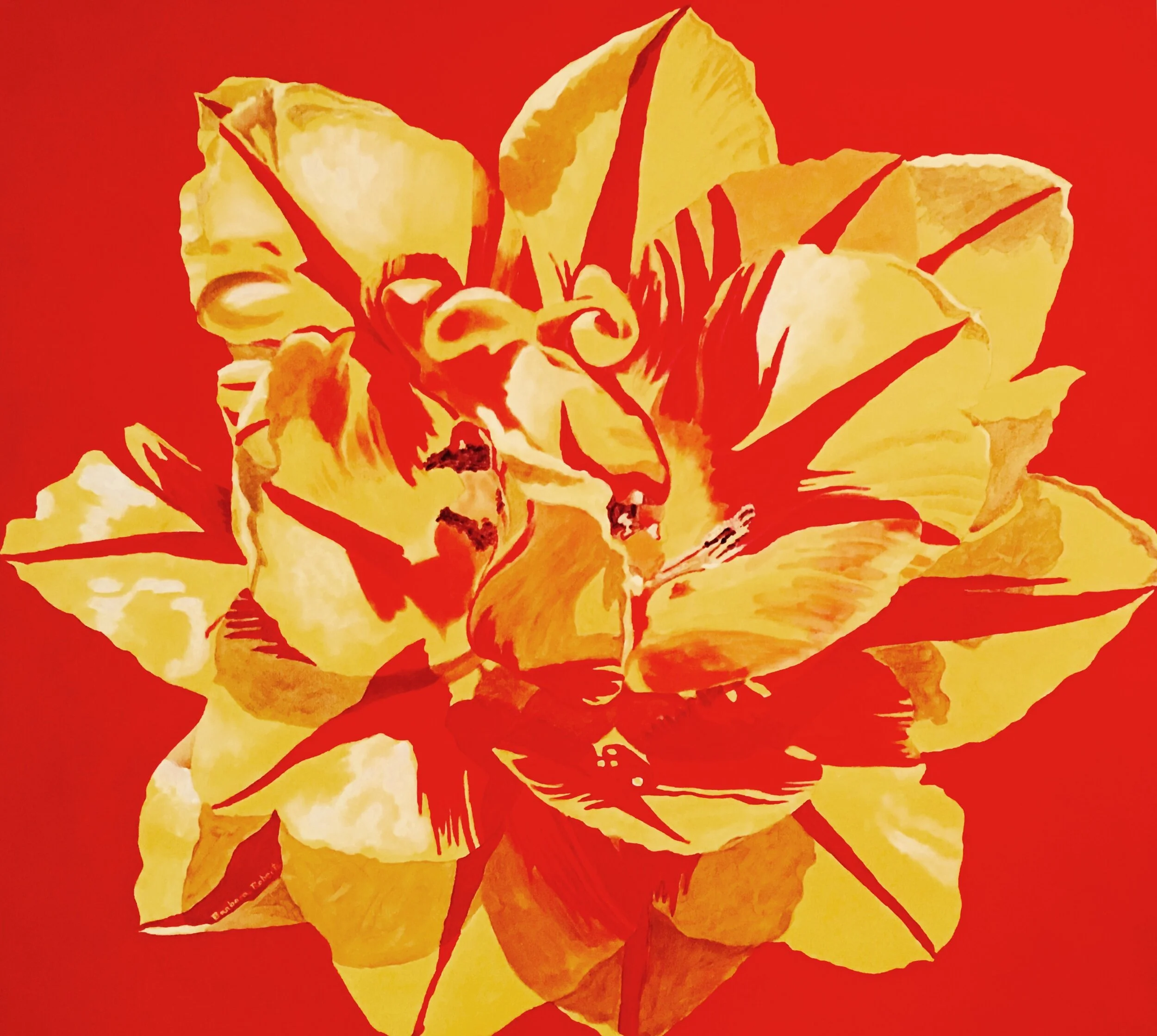 32”w x 33”h - Acrylic - A double yellow tulip found at the Coastal Maine Botanical Garden in Boothbay, Maine. Gold-edged black floater frame. $4,000