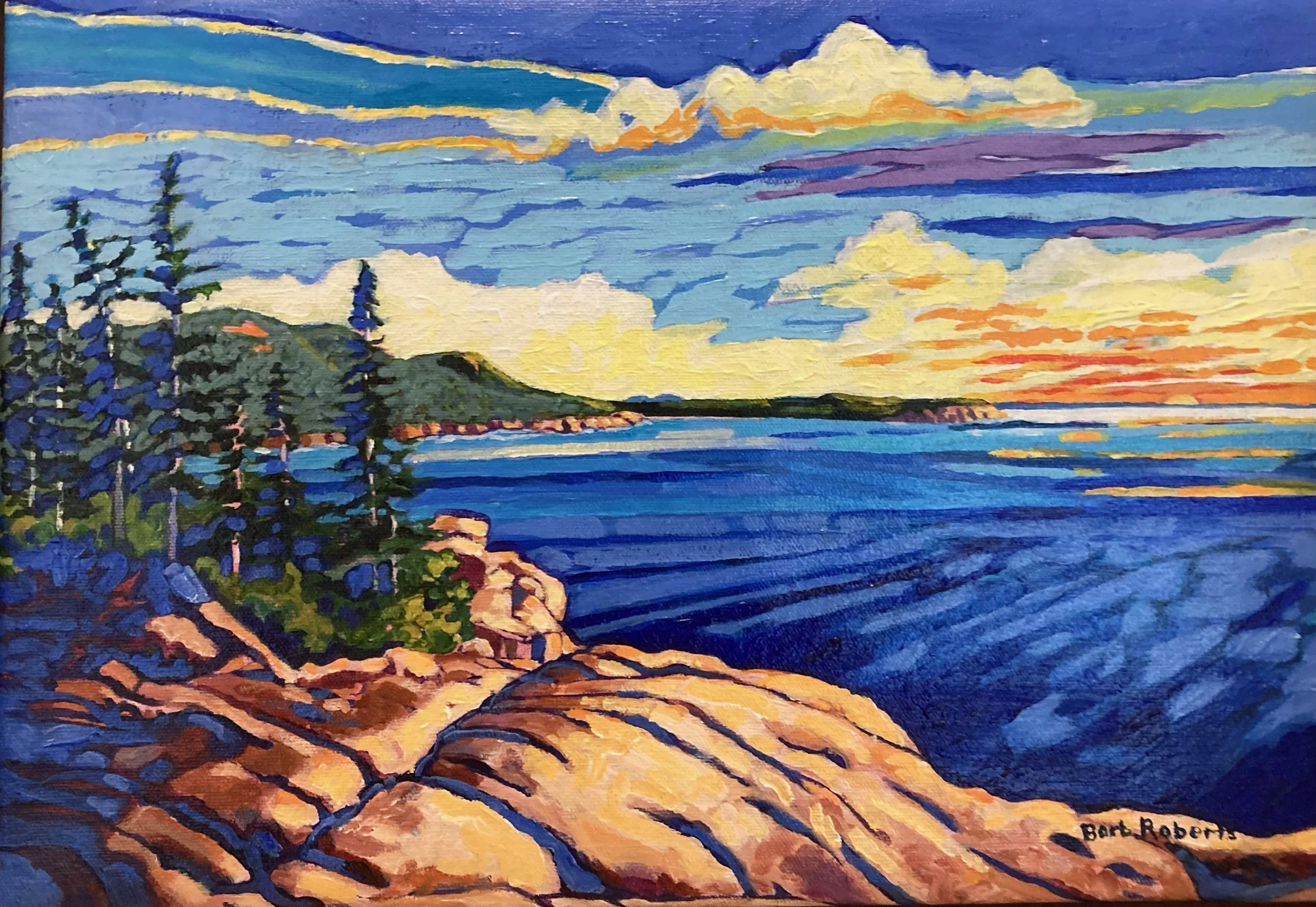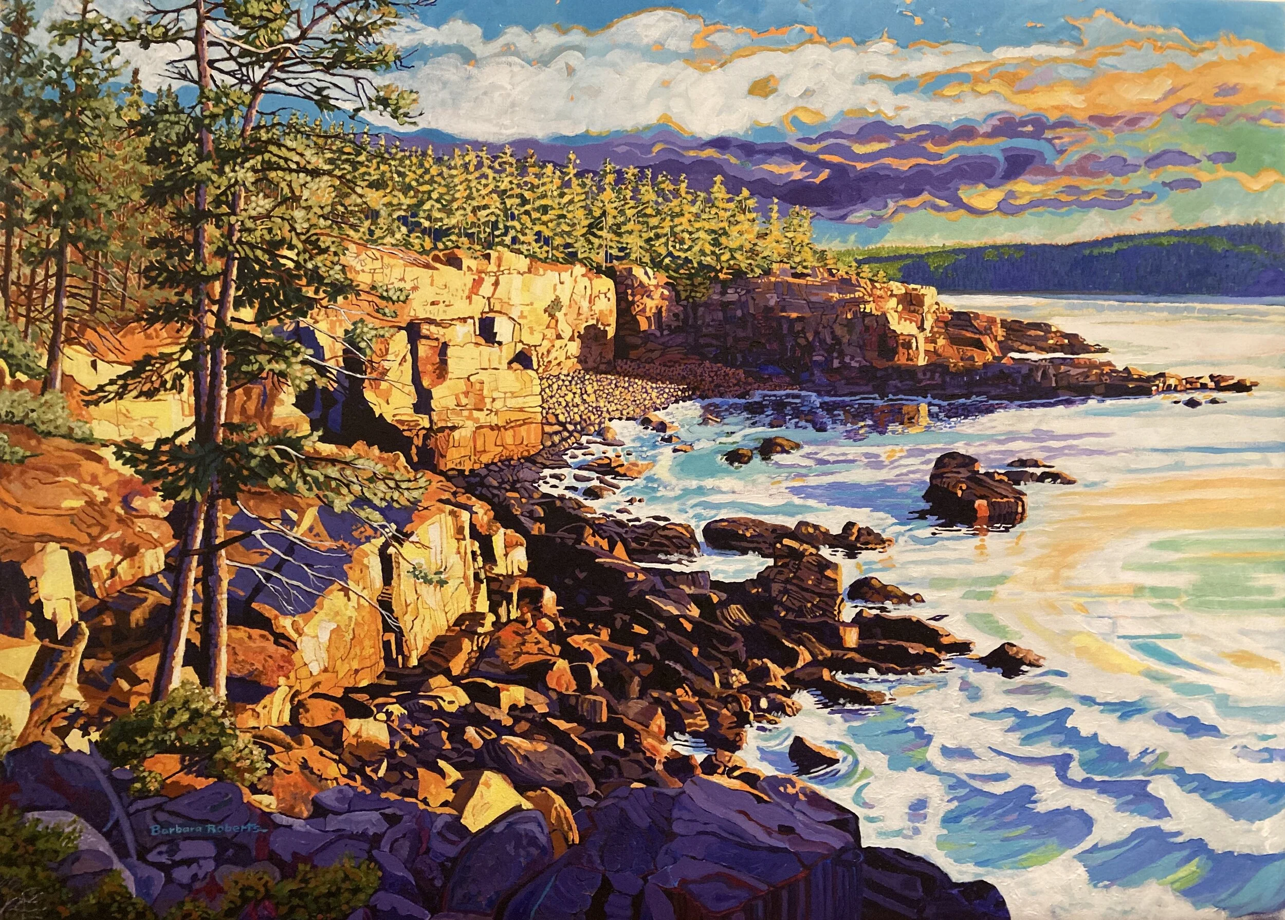36”w x 26”h - Acrylic - Such a beautiful morning in Acadia National Park that even the bushes were shouting, “hurrah”! Gold-edged black floater frame. $4,000