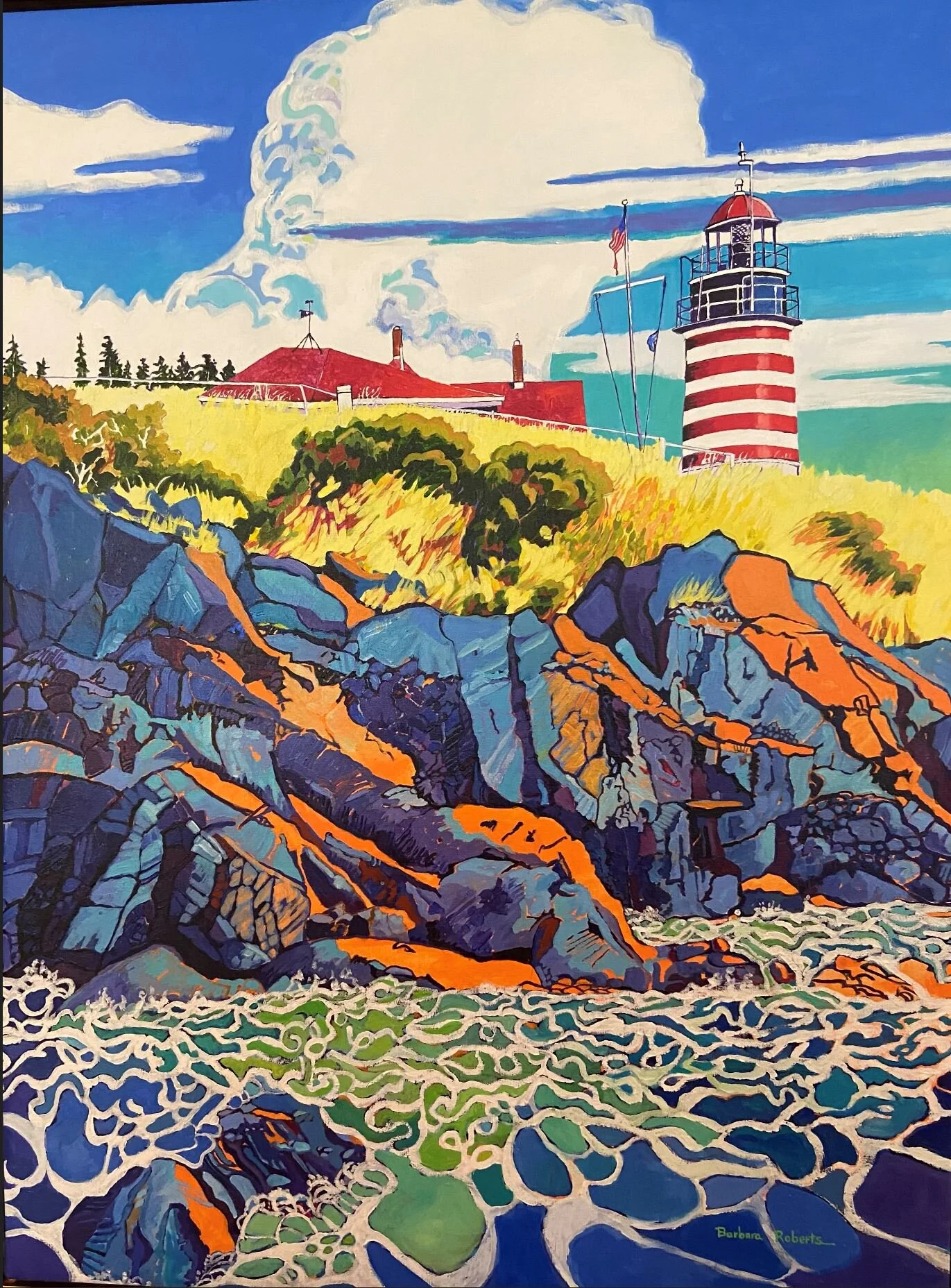 33”w x 45”h - Acrylic - This lighthouse is very dramatic, dressed in its bold red and white stripes. It stands the farthest east of any lighthouse in the United States. Gold-edged black floater frame. $4,000