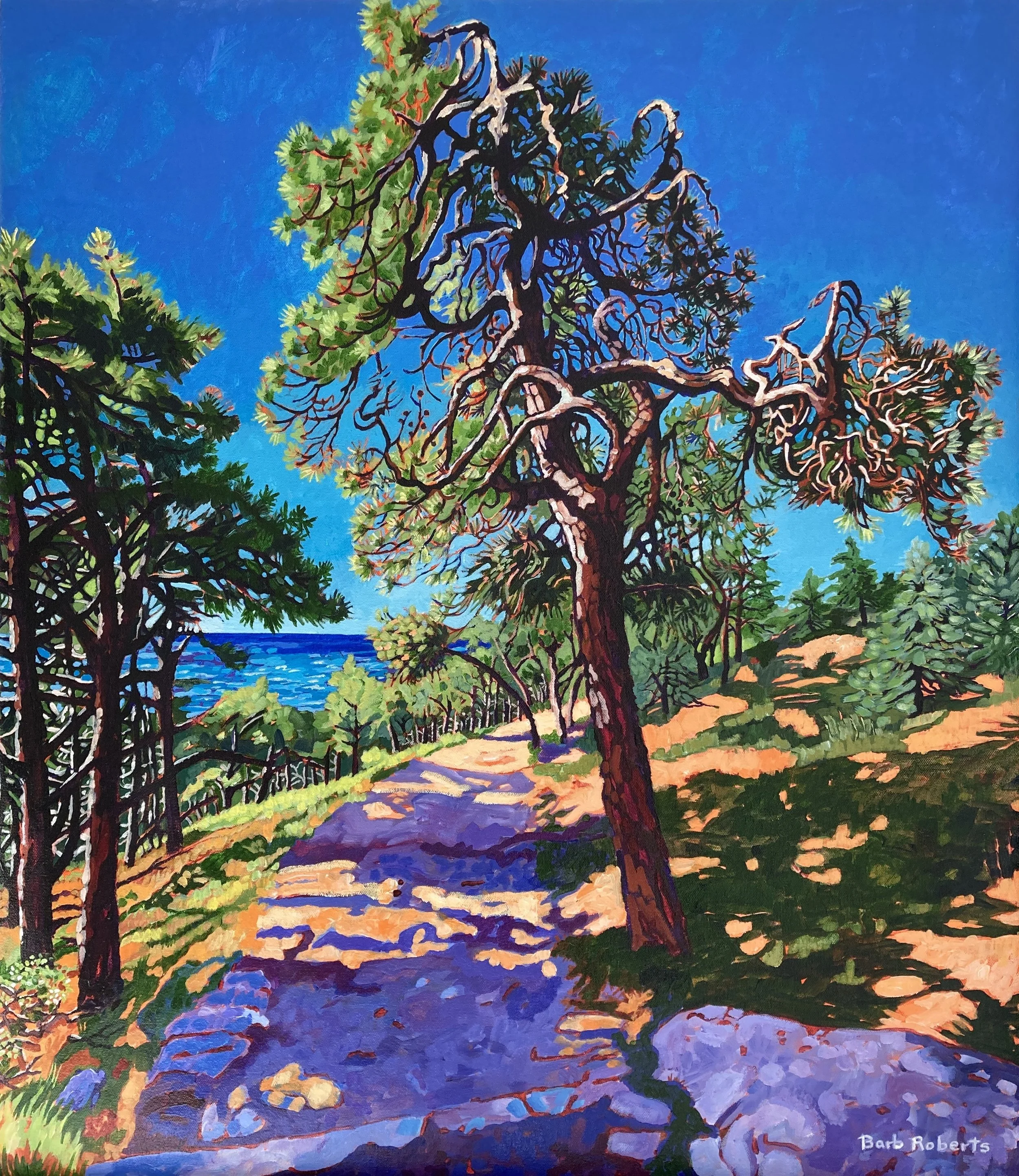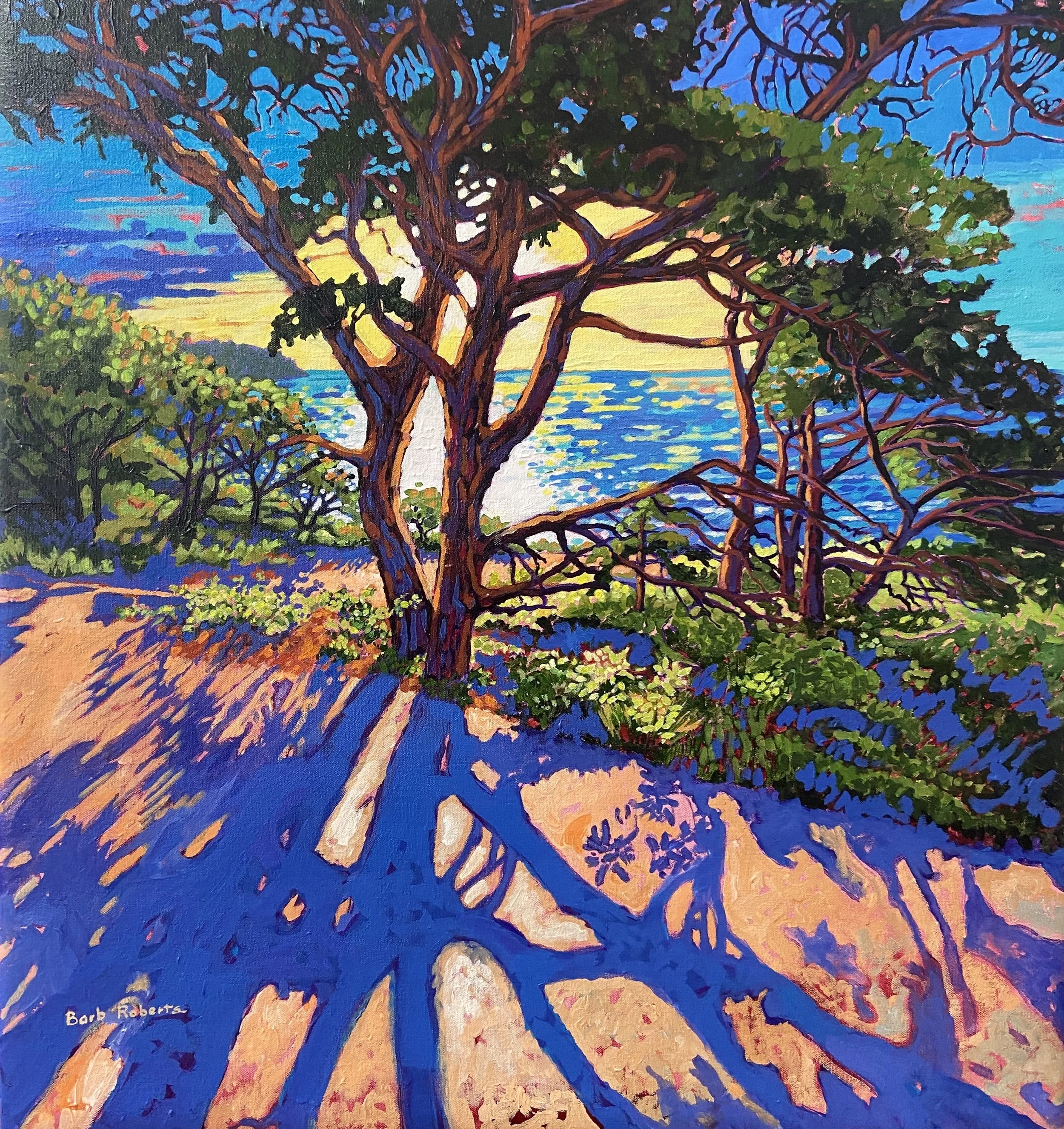 26”w x 30”h - Acrylic - One morning in June, looking for interesting subjects on the shore path in Acadia National Park, I found this tree. It’s also called “Pinus Contorta” and “lodgepole pine”. I was very excited to paint it and its shadowed path. Gold-edged black floater frame. $4,500