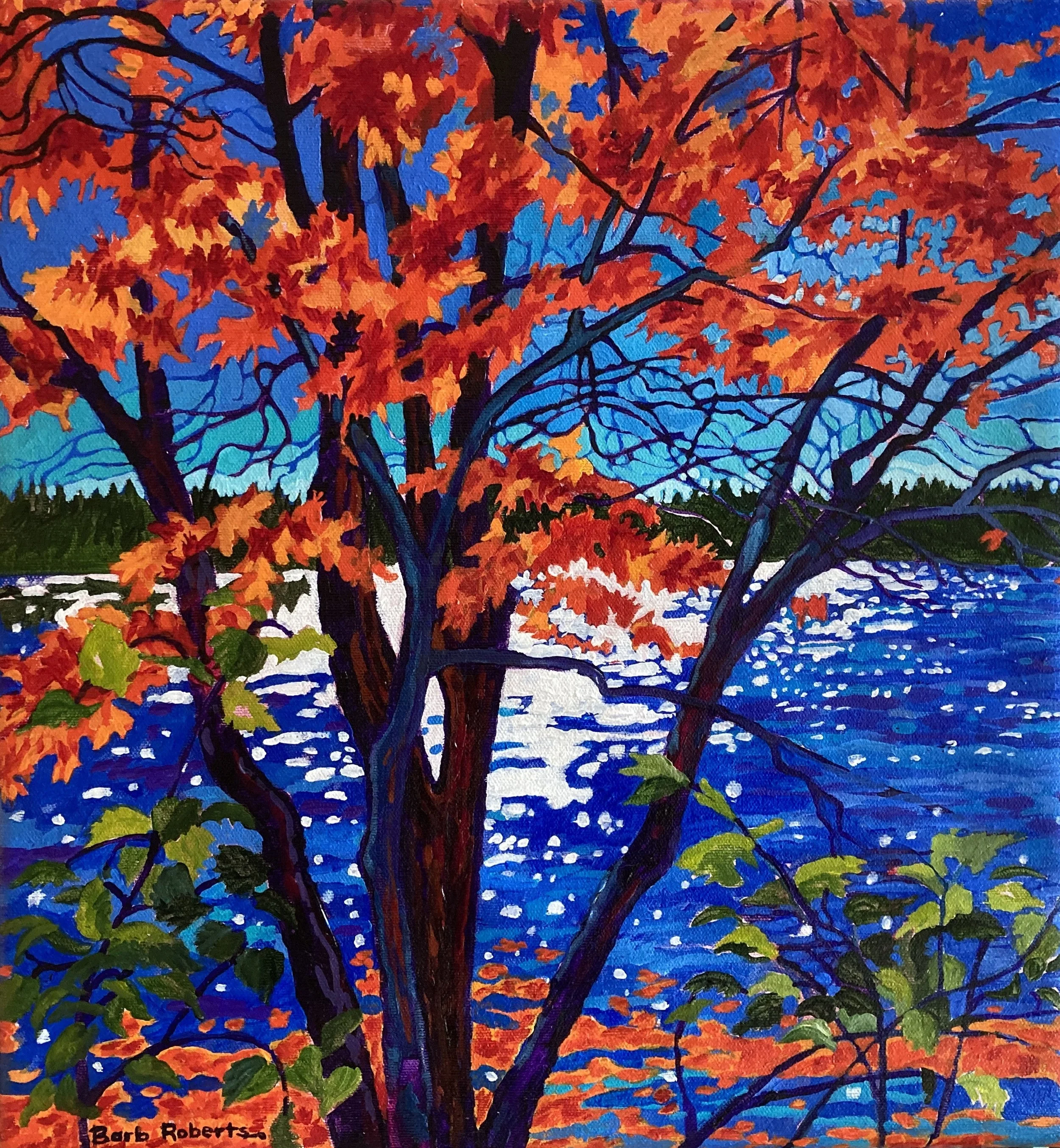 15”w x 16”h - Acrylic - Small maple dressed in fall finery, its leaves falling on Jordan Pond. Gold-edged black floater frame. $1,100