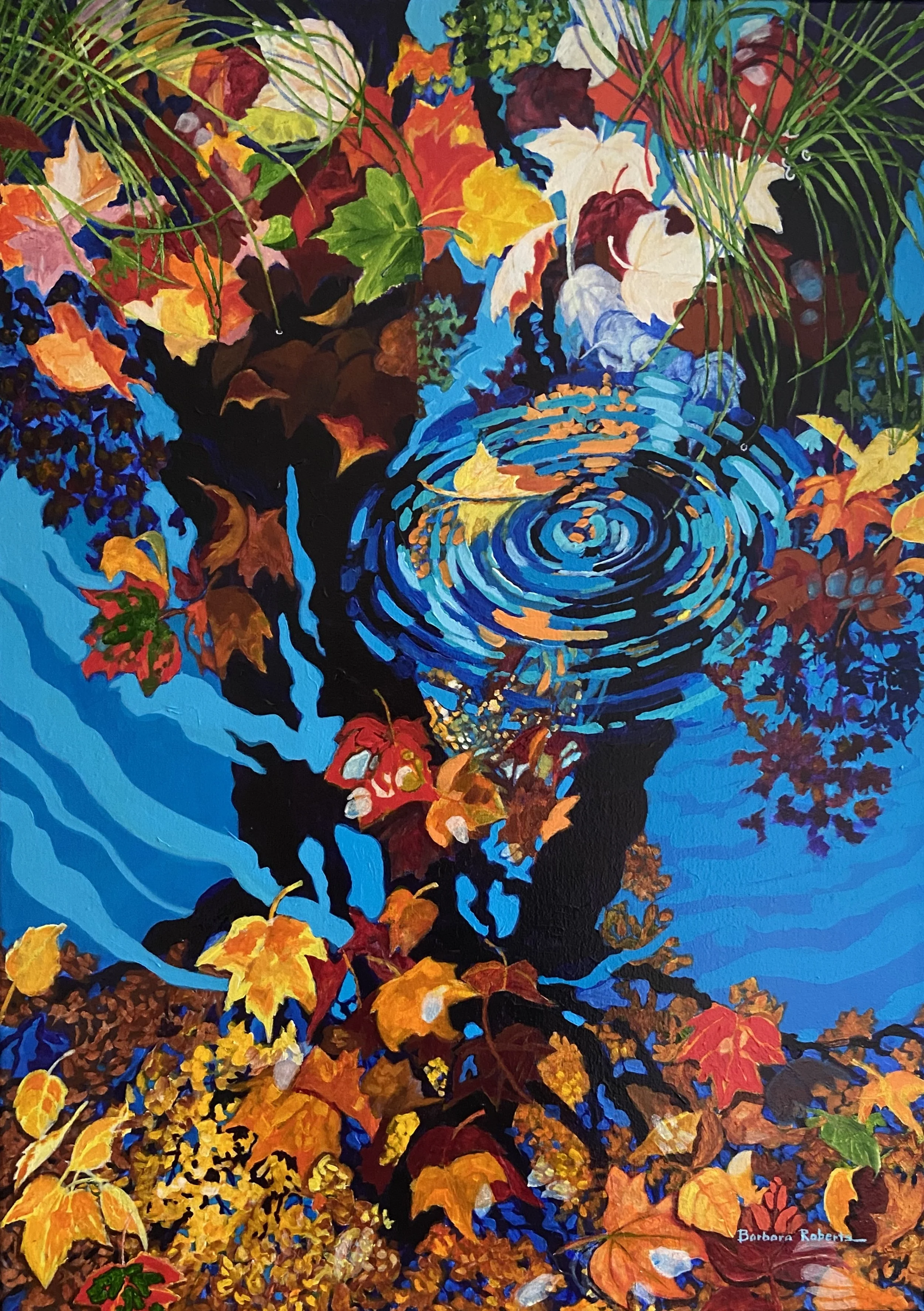 28”w x 39”h - Acrylic - I happened to walk there on a brilliant blue fall day after a hard rain in Acadia National Park. Gold-edged black floater frame. $4,000