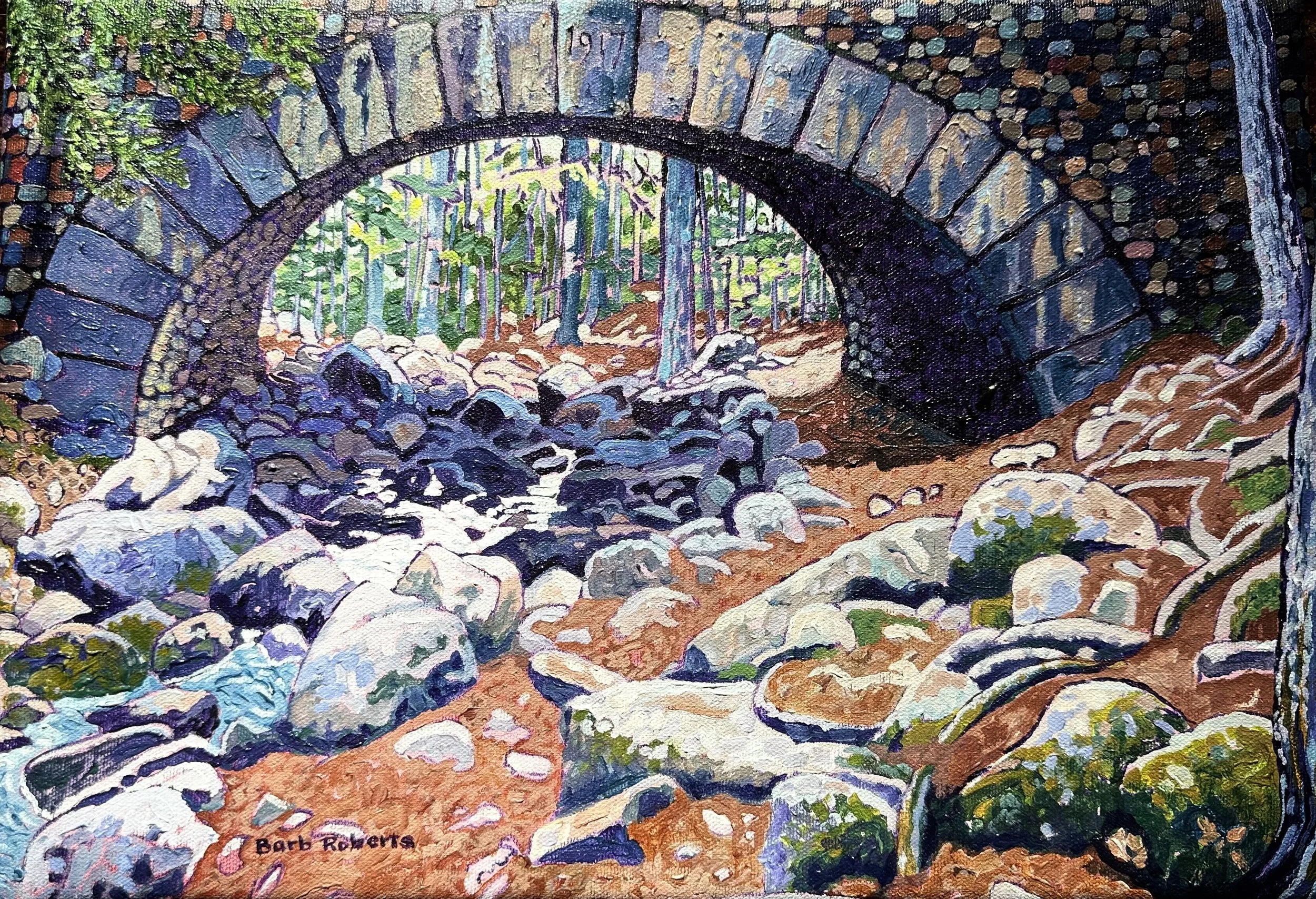 16“w x 11“h - Acrylic -Cobblestone Bridge was Rockefeller’s first bridge at Acadia National Park. I walked there one early morning to find trees overhanging the bridge, creating a dark and damp atmosphere. The bridge built in 1917 has stood the test of time.