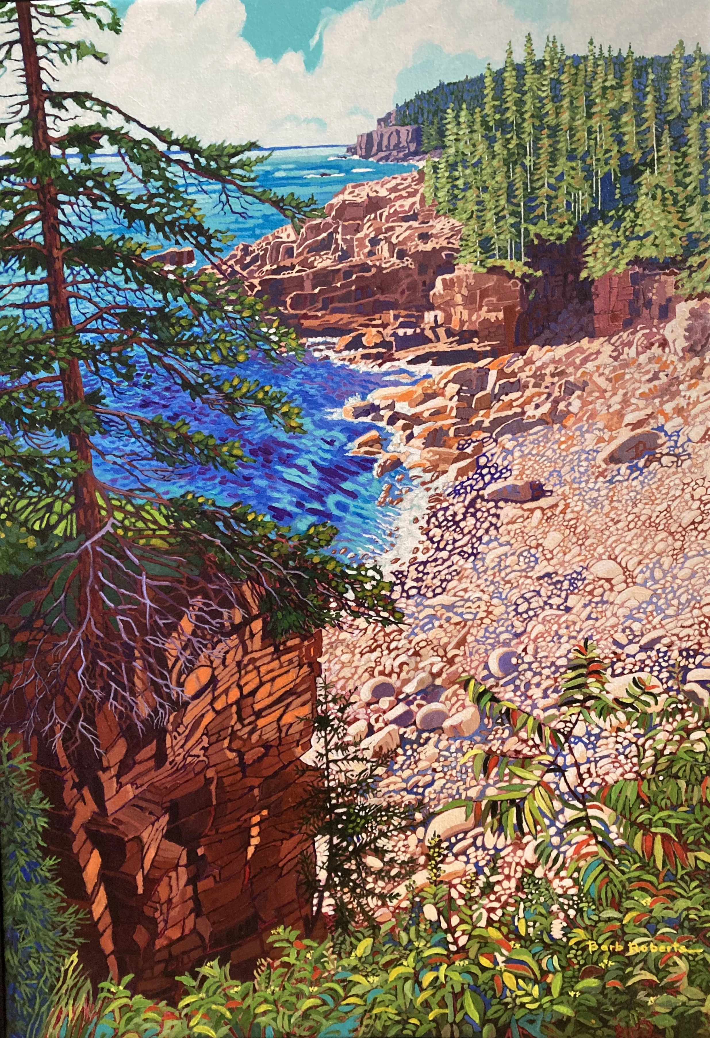 18”w x 24”h - Acrylic - On a morning walk along the shore path looking down on the rocks of Monument Cove, I was struck by the fragility of the monument and the wall of rocks behind it. In Arcadia National Park. Gold-edged black floater frame. $2,000